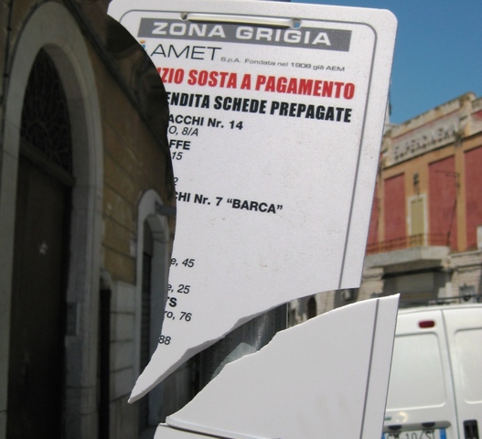 Per fortuna, qualche metro più avanti, si trova il gemello, ancora sano. Ma qui emergono le curiosità: le rivendite di tabacchi hanno dei numeri ma, delle due, una sola ha un nome; in un bar il caffè lo servono tanto ristretto che vi manca anche l’accento. Anche su altri cartelli non mancano le “imperfezioni”, ma siamo certi che vi è tempo per porvi rimedio: il servizio è ancora “sperimentale”. E poi, quando arriveranno i parcometri, i cartelli andranno tutti in soffittà. Pardon, soffitta.