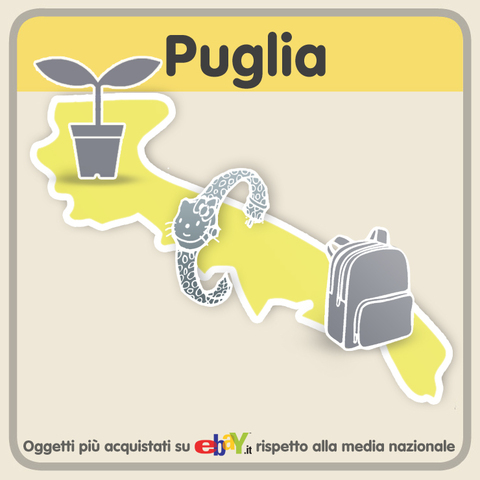 La Puglia si posiziona nella prima metà della classifica delle regioni italiane sia per oggetti acquistati (9° posto, dopo la Campania e prima della Liguria), che per euro spesi su eBay.it (sempre 9° posto, dopo la Campania ma prima della Sardegna). Rispetto alle province della regione, è Bari ad essere la più attiva su eBay.it, sia per numero di oggetti comprati, che per spesa. Al secondo posto troviamo la provincia di Lecce mentre al terzo posto si posiziona Foggia. Brindisi e Barletta-Andria-Trani chiudono, dopo Taranto, la classifica regionale.