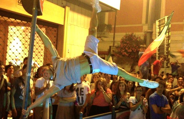 A fronte dei soliti imbecilli che l’hanno rovinata, la festa post Italia-Germania ha trovato qualcuno che l’ha fortunatamente valorizzata. Fra tante bandiere tricolori, infatti, è sputata quella umana, Stefano Scarpa, il tranese trionfatore di “Italia’s got talent”, che ha utilizzato un segnale stradale non per danneggiarlo, come hanno fatto alcuni stupidi, ma per issarsi e festeggiare “alla sua maniera” la vittoria della Nazionale.