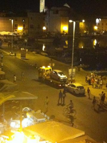 Dopo il diverbio-rissa tra un automobilista ed un vigile, dopo la denuncia, arrivano i rinforzi: carro attrezzi in azione ieri sera sul porto per portare via le auto parcheggiate all'interno dell'area portuale dove da ieri vige il divieto assoluto di parcheggio dalle 21 alle 2. La foto è stata scattata da un utente di TraniSpia e pubblicata sul social network.