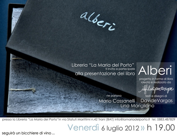 Venerdì 6 luglio alle ore 19 presso Libreria La Maria del porto, in via Statuti Marittimi 42 a Trani, Mario Cassanelli presenterà il libro "Alberi" di Davide Vargas, edito da Il filo di Partenope. Interviene l'editore. A seguire sarà possibile gustare un bicchiere di vino all'interno dell'affascinante libreria sul porto.