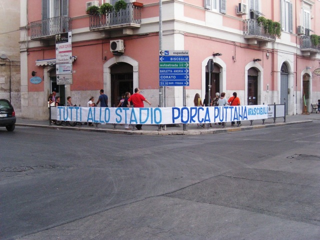 Gli striscioni agli incroci delle strade per invitare la gente allo stadio non sono una novità. Ma uno contenente un palese turpiloquio non si era ancora visto. Un gruppo di tifosi del Trani, gli «Irascibili», lo ha esposto nel pomeriggio, al crocevia fra via Aldo Moro e corso Imbriani, destando l’inevitabile attenzione dei passanti, forse più colpiti dalla forma che dal contenuto dello slogan.