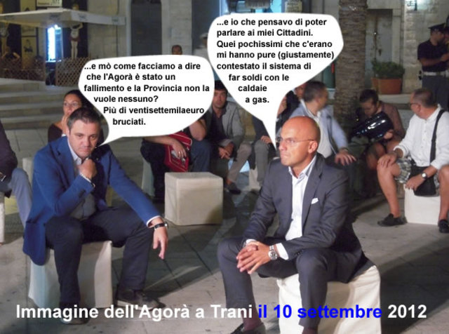 La speranza di vedere un seppur minimo cenno di interesse verso il cerbero a tre teste, è definitivamente svanita con l’incontro del 10 settembre scorso a Trani. L’Agorà nell’ultimo capoluogo dove si sperava di recuperare la brutta figura di Barletta e le forti critiche giunte dai cittadini andriesi ha definitivamente sancito il fallimento di questo tour costato oltre ventisettemila euro bruciati.