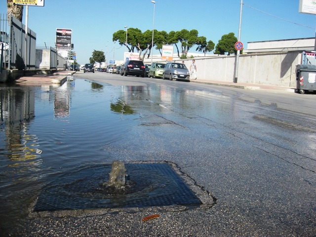 Altrettanti tombini si sono rotti e da questi zampilla acqua nera che si sta sversando sulla strada ed ha allagato un'area di servizio e l'ingresso dell'Amiu. Altri due, "saltati" qualche ora dopo gli altri, si trovano invece presso piazza Indipendenza.