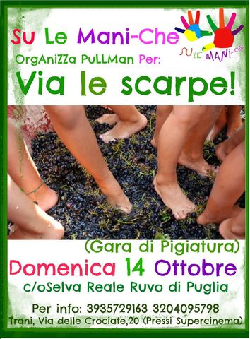 Una domenica diversa, fuori dalle mura cittadine con "Su Le Mani-Che!". Lo staff dell'associazione organizza una piccola gita fuori porta con l'iniziativa "Via le Scarpe!", una gara di pigiatura dell'uva.