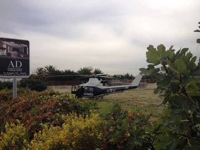 Un ripetuto volteggiare di elicotteri dei Carabinieri nel cielo di Trani ha fatto pensare ad un’operazione di polizia in corso. Tanto più che un utente ha visto e fotografato uno di quegli elicotteri dopo essere atterrato, nei pressi della vecchia statale 16 fra Trani e Barletta. Sempre lo stesso mezzo aereo, od altro simile impegnato nella stessa attività, è atterrato dall’altra parte della città, in questo caso nei pressi della vecchia statale 16 per Bisceglie.