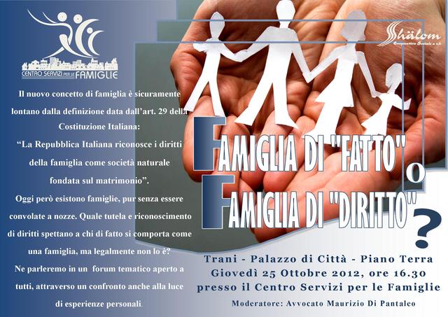 Il prossimo 25 ottobre 2012, alle ore 16.30, presso il Centro Servizi per le Famiglie si terrà il forum tematico "Famiglia di fatto o famiglia di diritto?", aperto a tutta la cittadinanza e interamente gratuito, presso il suddetto centro.