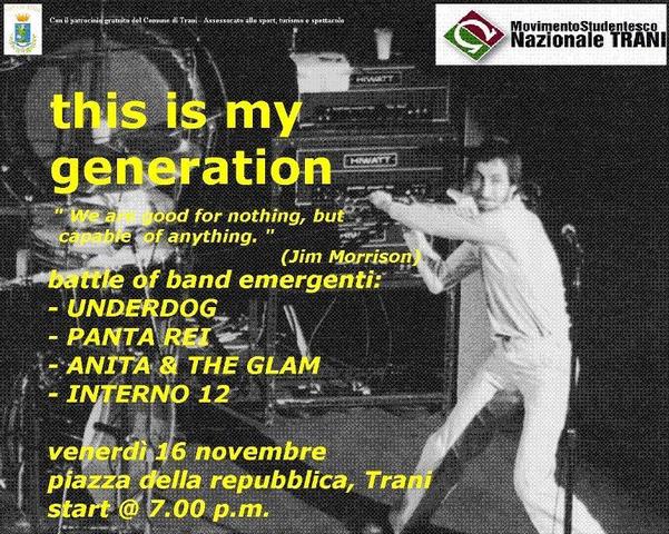 This is my generation ha il fine di proporre nuovi spazi culturali e, soprattutto, valorizzare giovani talenti tranesi. Le band emergenti (Underdog, Panta rei, Anita and the glam e Interno 12) si esibiranno sul palco proponendo anche pezzi inediti. «Siamo convinti - affermano gli organizzatori Fabio Grande e Salvatore Scandamarre - che il concerto sia un'opportunità fondamentale non solo per i gruppi partecipanti, ma anche per il pubblico partecipante. Inoltre, crediamo che eventi di tale portata siano da stimolo per avvicinare al mondo della musica tantissimi nostri coetanei».