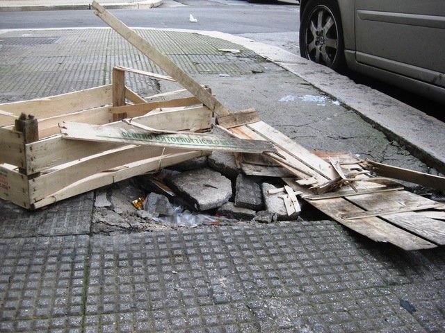 Qualcuno, quindi, si è inventato una delle classiche e maldestre soluzioni “fai da te” adagiando sull’enorme buca due cassette delle frutta. Una, però, si è frantumata e, pertanto, è essa stessa fonte di pericolo per le schegge di legno ed i punti metallici che spuntano dappertutto.