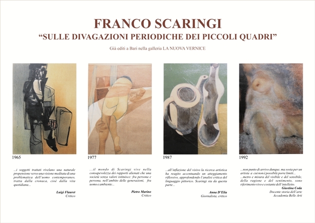Inizierà il prossimo 8 dicembre nei locali della sala di animazione culturale "San Luigi" (piazza Mazzini 15) e si concluderà il successivo 16 dicembre la mostra dell'artista tranese Franco Scaringi dal titolo "Sulle divagazioni periodiche dei piccoli quadri", già edita presso la galleria La Nuova Vernice in Bari.