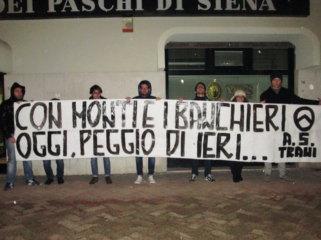 Militanti di Avanguardia studentesca Trani hanno esposto uno striscione davanti alla sede di una banca in occasione del "No Monti day", giornata indetta a livello nazionale dal movimento degli studenti identitari. «Con Monti e i banchieri... oggi, peggio di ieri», si legge nel cartellone, volutamente esibito nei pressi di un istituto bancario. Il "No Monti day" nasce dal desiderio dei militanti di «dire basta alle banche e poteri forti che distruggono la scuola, l’occupazione giovanile, la cultura nazionale ed il futuro degli studenti».