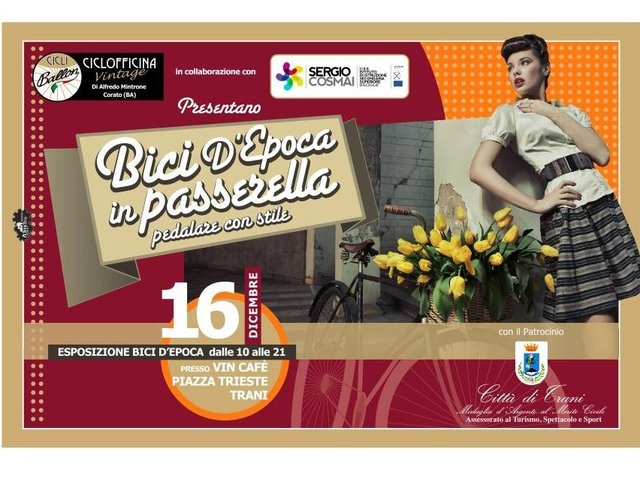 Domenica prossima, 16 dicembre, in occasione dell’evento «Bici d’epoca in passerella», l'associazione culturale “Europæ” organizza la quarta edizione del “Cicloraduno di Trani”, biciclettata collettiva per le vie della città. La partenza è prevista per le ore 10 dall’infopoint turistico di piazza della Repubblica. Dieci anche i chilometri da percorrere lungo un itinerario che interesserà le principali strade cittadine.