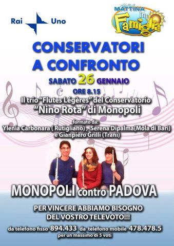 Un giovane concittadino, accompagnato da due "colleghe", delizierà gli spettatori di Uno Mattina durante la rubrica "Conservatori a confronto" suonando un pezzo per tre flauti. L'appuntamento, inizialmente fissato per il giorno 29 dicembre, è stato posticipato al 26 gennaio 2013.