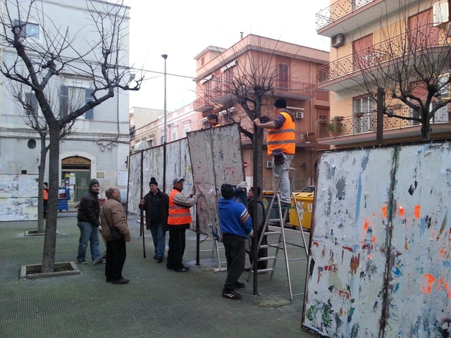 Come disposto per legge, oggi, ad un mese esatto dal voto del 24 e 25 febbraio, si stanno installando in città i pannelli per la propaganda elettorale di partiti e candidati alle elezioni politiche. Il servizio elettorale ha, nei giorni scorsi, bandito una gara d’appalto fra le cooperative sociali di Trani, all’esito della quale si sta procedendo al montaggio delle strutture. Le foto si riferiscono alle operazioni in corso in via Giustina Rocca.