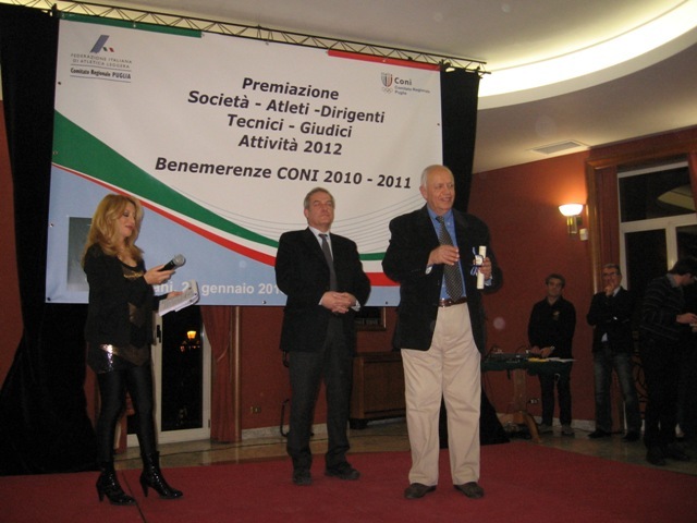 Nella splendida ed elegante cornice di Palazzo San Giorgio a Trani, in una sala convegni stracolma di sportivi ed appassionati dello sport, si è celebrata la Festa dell’Atletica Pugliese 2012. A fare gli onori di casa il Sindaco, Gigi Riserbato, il Presidente della Fidal Puglia, Angelo Giliberto, e il Presidente del CONI Puglia, Elio Sannicandro.