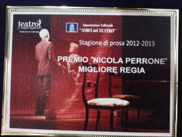 Un nuovo riconoscimento è stato assegnato ieri, domenica 3 febbraio, alla “Compagnia dei Teatranti”, nell’ambito della «Stagione di prosa 2012/2013, nel corso della serata «Premio Orlando Leone» presso il teatro “Il Saltimbanco”, di Santeramo in Colle. L’evento, organizzato dall’associazione culturale «Amici del teatro», ha visto la partecipazione di otto compagnie teatrali provenienti da Trentino, Campania, Sicilia e Puglia.