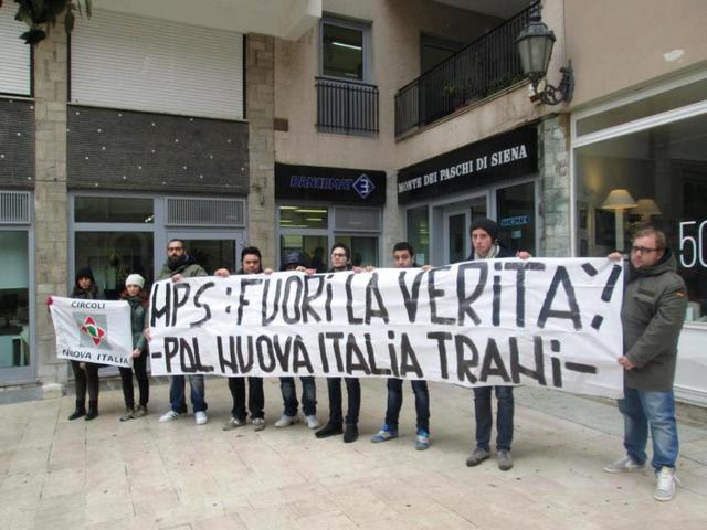 Il gruppo dei ragazzi del circolo Nuova Italia Trani si è presentato questa mattina in via San Giorgio, all'esterno della filiale tranese del Monte dei Paschi di Siena per distribuire volantini (sui quali compare il nome "Monte dei Paschi di sinistra" ed esporre uno striscione: Mps, fuori la verità!