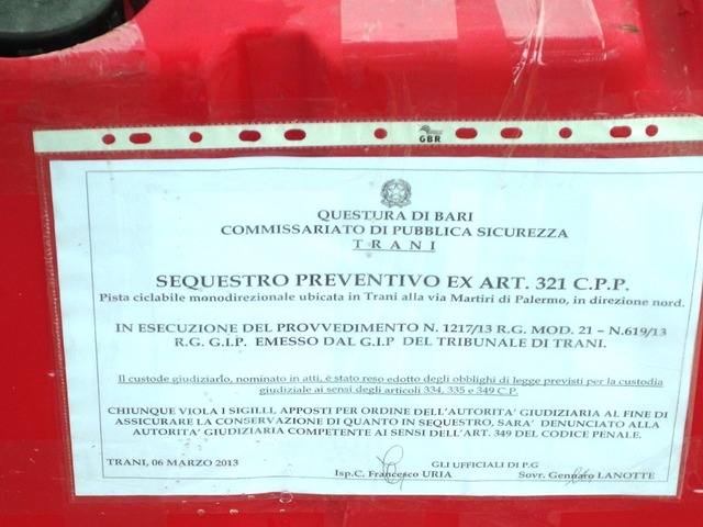 Gli agenti del Commissariato di pubblica sicurezza di Trani hanno esaguito il sequestro preventivo della pista ciclabile realizzata lungo via Martiri di Palermo, sul lato sinistro della direzione di marcia verso Corato. Il provvedimento, firmato dal Gip Roberto Oliveri del Castillo, è stato richiesto dal pm Giuseppe Maralfa, che ha iscritto nel registro degli indagati un geometra dell'ufficio tecnico, Salvatore Ferrante, per presunto falso ideologico.