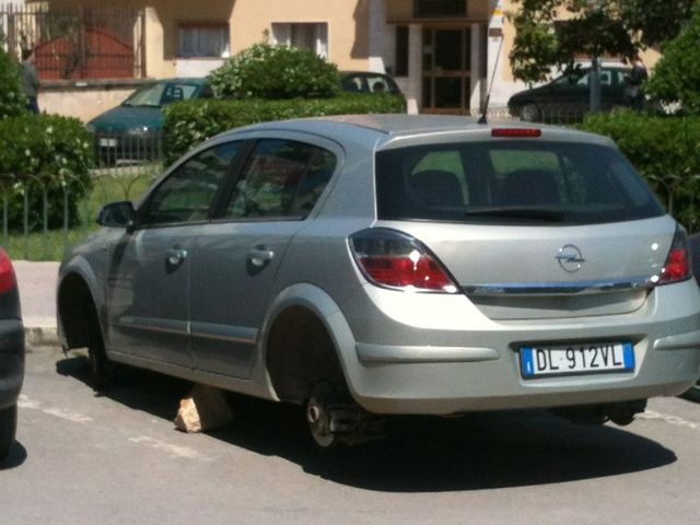 L'altra notte alcuni malviventi avrebbero rubato le ruote ad un'Opel grigia modello station wagon parcheggiata in piazza Martiri di via Fani. I ladri hanno poggiato due massi al centro della vettura per procedere senza alcun intoppo nel lavoro di sottrazione dei quattro pneumatici. L'ultimo furto simile risale a ben tre anni fa quando la Polizia arrestò in flagranza di reato due giovani barlettani.