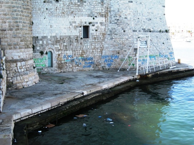 A rendere ancora più desolante l'impatto visivo, già fortemente compromesso da quella gran quantità di spray disseminato sulle pietre bianche, colpisce l'incredibile quantità di sacchetti di spazzatura galleggianti nel mare a stretto ridosso di quella stessa zona.