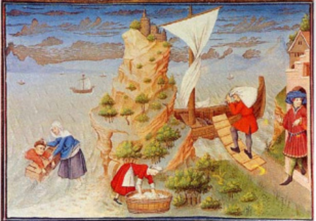 Chiesto alla donna un panno nel quale poter porre le pietre, “recatosi suo sacco in collo, da lei si partì: e montato sopra una barca, passò a Brandizio e di quindi marina marina si condusse infino a Trani, dove trovati de’ suoi cittadini li quali eran drappieri, quasi per l’amor di Dio fu da lor rivestito, avendo esso già loro tutti li suoi accidenti narrati, fuori che della cassa; ed oltre a questo, prestatogli cavallo e datagli compagnia, infino a Ravello, dove del tutto diceva di voler tornare, il rimandarono”.