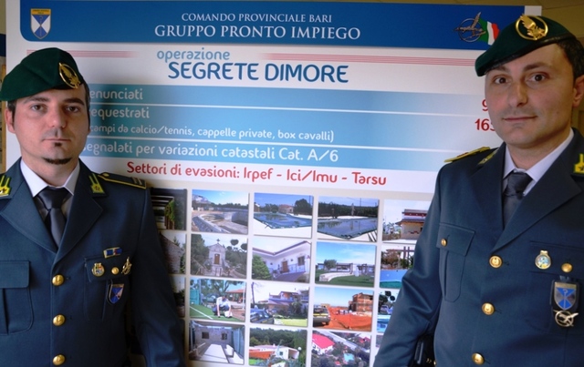 L’attenzione degli investigatori e’ stata incentrata, in particolare, sugli immobili rientranti nelle categorie catastali a/6 (abitazioni di tipo rurale) e c/2 (magazzini e locali deposito) insistenti nelle province di Bari e Bat, ma di fatto trasformati in dimore per le vacanze ove, in diversi casi, non mancavano pertinenze di pregio (piscine, impianti sportivi, ecc). Queste trasformazioni, così come emerso dall’incrocio dei dati risultanti presso il Catasto dei fabbricati e le banche-dati in uso alla Finanza, non erano in regola con la normativa urbanistica e fiscale.