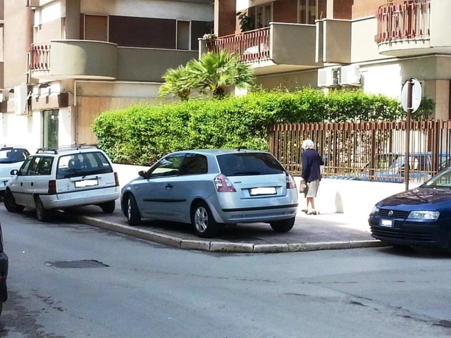 E dopo il famoso parcheggio sul marciapiede di via Malcangi, a due passi dalla parrucchiera per proteggere la "messa in piega" dalla pioggia, eccone un altro di parcheggio selvaggio con tanto di auto completamente sul marciapiede. La pratica del parcheggio a "due ruote" sul marciapiede è già abbastanza diffusa e condannabile ma qui viene surclassata dall'automobilista che sceglie di posteggiare la sua auto completamente sul marciapiede.