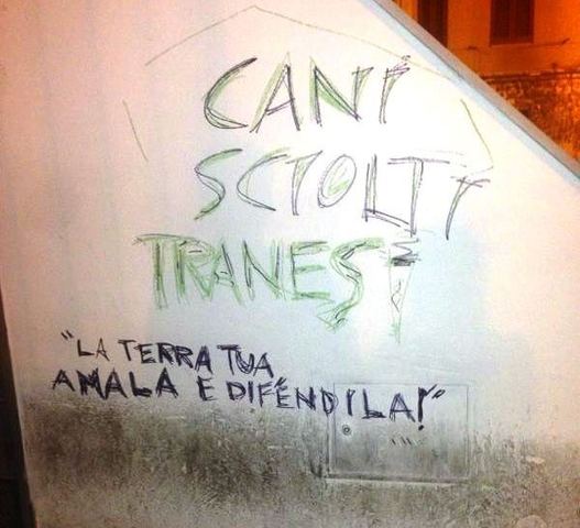 Ieri è comparsa in via Lagalante una nuova scritta su un muro bianco di una scalinata di pertinenza di un condominio: Cani sciolti tranesi - "La terra tua, amala e difendila!". Frasi nuove e frasi vecchie come quella in via Margherita di Borgogna che campeggia su quel muro da anni.