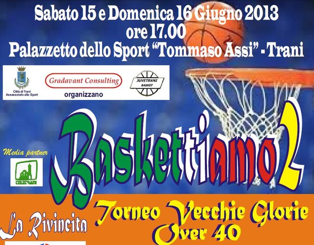 Si sono aperte le iscrizioni per il secondo Torneo Over 40 di Pallacanestro “Baskettiamo” che avrà luogo a Trani presso il Palazzetto dello Sport “Tommaso Assi” nei pomeriggi di sabato 15 e domenica 16 giugno. Organizzato dalla A.S.D. Juve Trani, in collaborazione con l’Assessorato allo Sport della Città di Trani e con la Gradavant Consulting, azienda tranese anima di tanti eventi sportivi della nostra Città negli ultimi 13 anni, il Torneo si propone come punto d’incontro di tutti gli amanti del basket di una certa età per un doppio pomeriggio di sano divertimento.