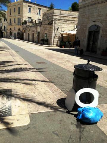 I più ottimisti però potrebbero dirci che è opera di una "banda" di moderni artisti o comunicatori dato il "filo rosso" che lega i tre water buttati nei pressi di bidoni della spazzatura nella sola giornata di ieri.
