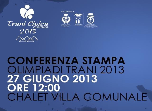 La conferenza stampa si terrà presso lo Chalet della Villa Comunale nel giorno 27 Giugno alle ore 12:00. Interverranno: Avv. Luigi Nicola Riserbato - Sindaco di Trani, Dr. Fabrizio Ferrante - Presidente del Consiglio Trani, Dr. Fabrizio Sotero - Assessore allo Sport, Dr. Nicola Loprieno - Allenatore Judo Trani - Dr. Stefano Vitucci - Presidente Ass.ne Trani Civica, Dr. Antonio Loconte - Segretario Ass.ne Trani Civica, Modera: Dr. Francesco de Noia, Consigliere Comunale.