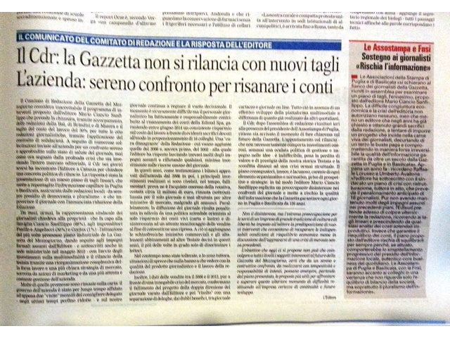 Risulta evidente che in gioco non vi è solo la difesa del lavoro di tanti onesti cronisti o il prestigio di quotidiani con una storia ultrasecolare alle spalle, ma anche l'autonomia e la libertà dell'informazione nel nostro territorio. Esprimo la mia totale solidarietà alla redazione nord barese de “La Gazzetta del Mezzogiorno” ed ai giornalisti e lavoratori della provincia e della regione vittime della crisi in atto anche nel mondo dell'informazione.