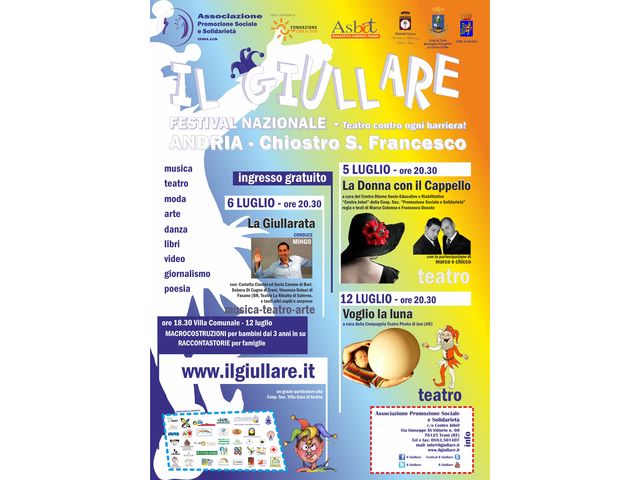 Il Giullare però vi riserva, in contemporanea, un appuntamento presso il Parco di S. Geffa a Trani, sempre venerdì 5 luglio alle ore 20.30: “Sotto le stelle ti racconto una bella storia”, a cura dell’associazione Xiao Yan – Rondine che ride di Trani. L’attività è destinata a bambini e famiglie.