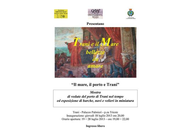 S’inaugura oggi a palazzo Palmieri, alle 20, la mostra «Trani e il mare, bellezze da amare», organizzata dall’associazione «Obiettivo Trani» con il patrocinio dell'Assessorato alla cultura, nell'ambito delle celebrazioni dei 950 anni dalla promulgazione degli Statuti marittimi. Si tratta di un’esposizione di vedute del porto di Trani nel tempo barche, navi e velieri in miniatura. Saluti di apertura da parte dell’amministrazione comunale e dell’associazione. La mostra resterà fruibile fino al 28 luglio, dalle 19 alle 22.