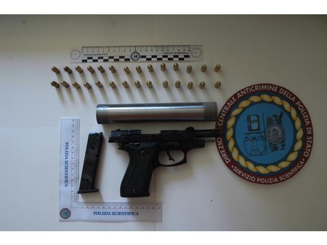 Le accurate operazioni consentivano il rinvenimento, in un podere abbandonato nella zona nord di Trani, sotto un folto cespuglio, di una busta in plastica che copriva una pistola Beretta cal. 9 corto, con matricola abrasa, caricatore monofilare vuoto, filettatura sulla canna per l’applicazione di silenziatore, 28 cartucce inesplose cal. 9 ed un silenziatore in acciaio cromato.