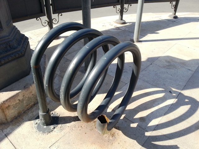 Ci riferiamo, in particolare, a due cabine telefoniche, ormai distrutte ma mai rimosse, e ad una rastrelliera per biciclette che è stata troncata e mostra due parti della lega metallica di cui è composta sporgenti e taglienti.