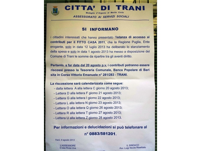A ricevere il contributo sul canone di locazione saranno 1565 cittadini. Complessivamente, a disposizione dei beneficiari, vi sarà una somma di 583mila euro, erogati dalla Regione Puglia ed alla quale il Comune di Trani quest'anno non ha aggiunto alcun cofinanziamento.