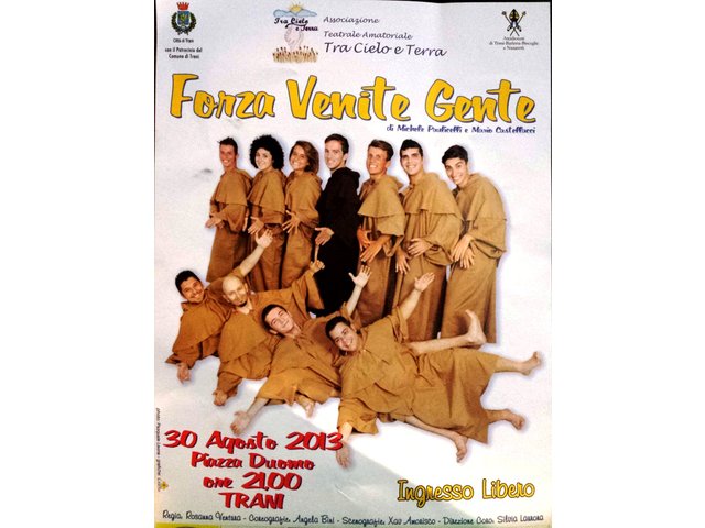 I ragazzi, guidati dallo spirito cristiano di umiltà e allegria, che tanto aveva impressionato in “Un Operaio di Dio” e in “Madre Teresa, il Musical”, sono pronti a mostrare il frutto di otto mesi di prove e sacrifici, con la speranza di parlare, ancora una volta attraverso il canto, il ballo e la recitazione, della bellezza della Parola di Dio per scoprire il vero senso della povertà, l'entusiasmo dei giovani e il messaggio evangelico intrinseco nella figura di Francesco. Il presidente Don Dino Cimadomo e tutta l’Associazione “Tra Cielo e Terra” (che il 9 Marzo scorso ha compiuto un anno dalla sua fondazione) vi invitano a partecipare allo spettacolo che si terrà in Piazza Duomo venerdì 30 Agosto, ore 21.00.