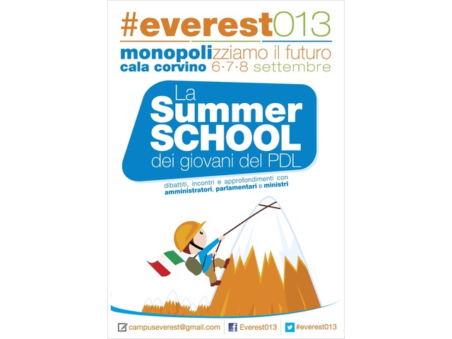 "Everest013" sarà un appuntamento atteso in tutta Italia in quanto offrirà una importante occasione di confronto con i leader nazionali del PDL e con le numerose personalità politiche oggi al centro del dibattito politico nazionale. Uno splendido scenario di vita comunitaria e partecipazione politica, così come sarà confermato dall'annuncio del programma.