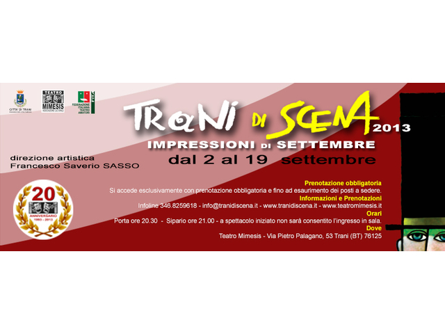 Trani Di Scena 2013 si svolgerà nella sede del Teatro Mimesis dal 2 al 19 Settembre presentando una serie di proposte che vanno dal teatro alla musica, al cinema.