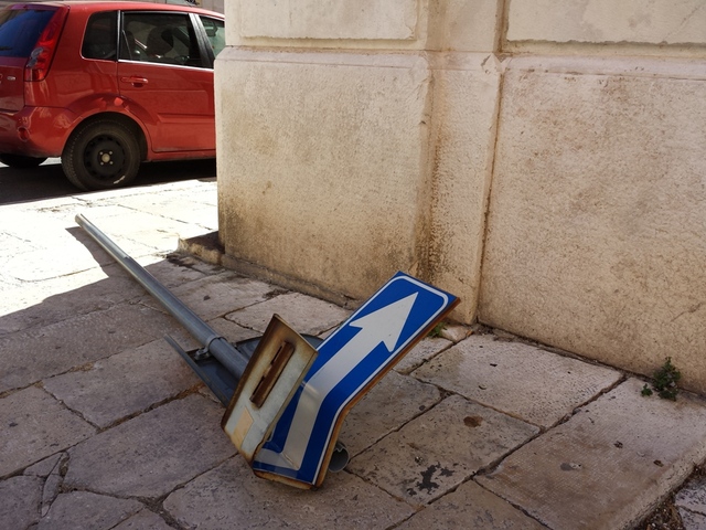 Un altro palo con indicazioni stradali si trova abbandonato, da ieri in via Cesare Lambertini, all'angolo con via Mosè da Trani. Anche in questo caso la circostanza è stata segnalata alla Polizia locale. Qui il palo rappresenta un pericolo per la deambulazione dei pedoni che potrebbero inciamparvi.