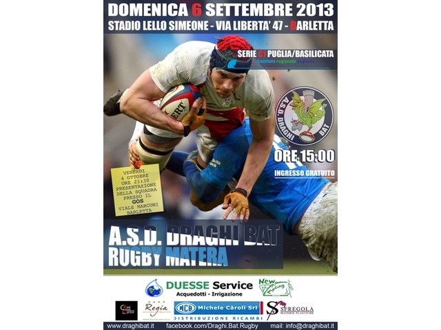 Presentazione ufficiale questa sera alle ore 21:30 c/o il Gos in Viale Marconi 49 a Barletta per i Draghi Bat, formazione che affronterà il prossimo campionato di Rugby di serie C Puglia Basilicata 2013/2014.