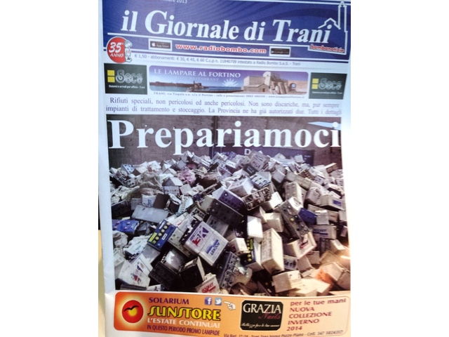Il nuovo numero de Il Giornale di Trani è in edicola con la prima pagina dedicata ai rifiuti speciali: "Prepariamoci". In apertura si apre proprio con i due impianti di trattamento di rifiuti speciali (non pericolosi) autorizzati dalla Provincia. Turismo culturale, per l'assessore Nardò è il futuro: «Quest'anno si è speso il giusto e ci sono le basi per un progetto di lunga durata». Lo sfogo del consigliere comunale Damascelli: «Mi avete lasciato solo».