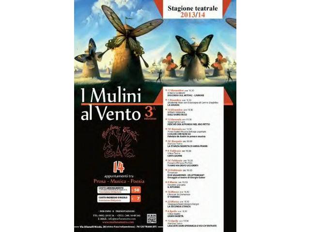 La compagnia «Marluna teatro», di Trani organizza la terza edizione della rassegna teatrale «I mulini al vento», stagione 2013/2014. Obiettivo, «proporre ed offrire al pubblico, tranese e non, spettacoli di artisti e compagnie pugliesi che non sempre riescono a rientrare nei circuiti ufficiali di distribuzione».