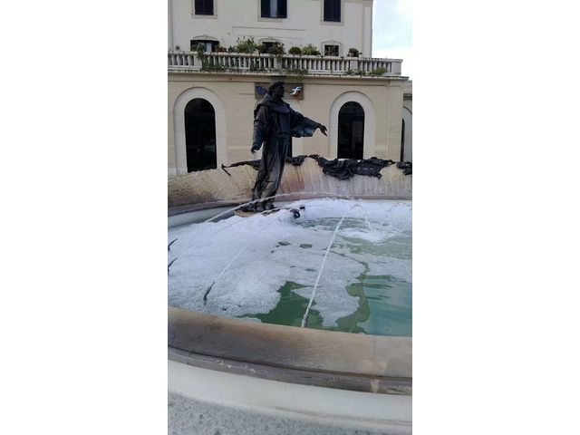 Di sicuro, in questo caso, nessuno potrà parlare di eutrofizzazione. La schiuma del mare di questa estate sembra essersi trasferita in piazza XX Settembre, ai piedi della statua di San Francesco, ma questa volta le alghe non c'entrano nulla: sicuramente, c'è di mezzo la mano dell'uomo.