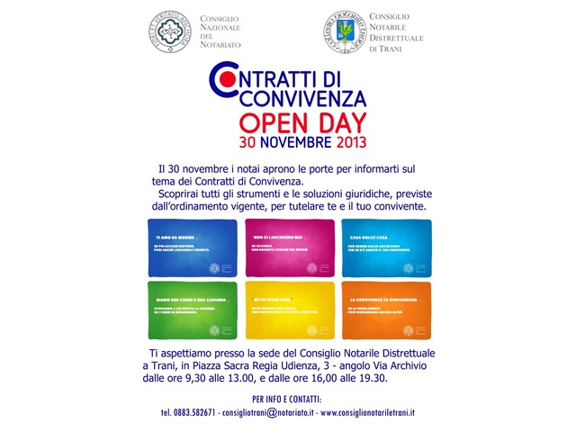 Avrà luogo oggi presso l’Archivio notarile di Trani, in piazza Sacra regia udienza, alle 10.30, un incontro con i cittadini sul tema dei “Contratti di convivenza”, nell’ambito del progetto approvato dal Cnn incentrato sugli “Accordi patrimoniali di convivenza”. I lavori del mattino proseguiranno fino alle 13, questa sera dalle 16 alle 19.30.