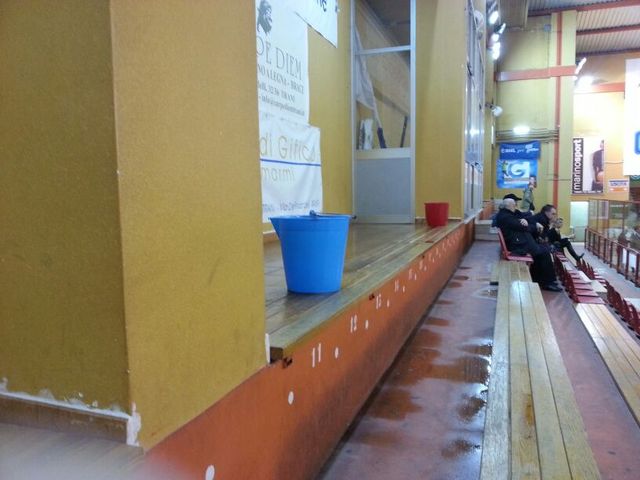 Proseguono i disagi in città a causa della pioggia: oggi è piovuto anche all'interno del palazzetto. L'acqua è gocciolata in maniera abbondante su parte degli spalti, costringendo gli spettatori della partita di pallacanestro Juve Trani-Potenza a sedersi nelle uniche zone asciutte. A fare da recipienti, alcuni bidoncini, solitamente utilizzati per i rifiuti.