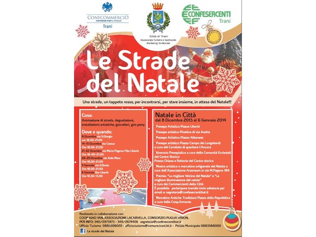 Domani, domenica 8 dicembre, è tempo di attesa e tempo di sogni, è anche tempo per incontrarsi. È con questo auspicio che, l’Amministrazione Comunale della Città di Trani congiuntamente con le Associazioni di categoria Confesercenti e Confcommercio invitano tutti i cittadini a dare inizio alle tante attività dal titolo Strade del Natale che, ci accompagneranno per tutto il periodo natalizio fino al 6 Gennaio 2014.