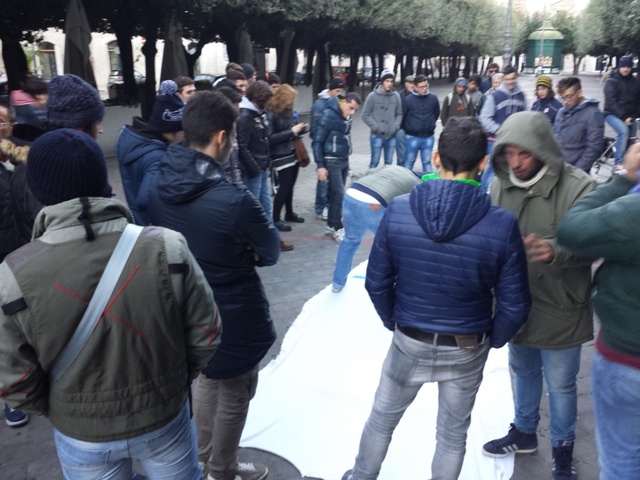 È ripresa nel pomeriggio, in piazza della Repubblica, la protesta dei manifestanti del 9 dicembre. Questa sera, dopo il corteo mattutino in cui s'era arrivati a fare sfilare quasi mille persone, si riparte dalla preparazione di striscioni di denuncia da porsi sulle transenne parapedonali ed altri luoghi in cui abbiano visibilità.