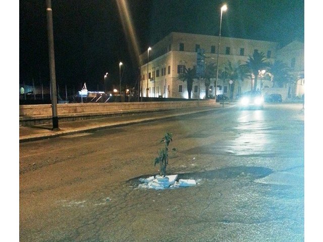 La protesta in corso del 9 dicembre ha, inevitabilmente, fatto mettere da parte i tanti problemi della città. Qualcuno, pertanto, sembra abbia voluto platealmente richiamarli inventandosi la piantumazione di un alberello all'interno della buca che si trova in via Statuti Marittimi, nei pressi della darsena comunale, in uno dei luoghi maggiormente trafficati di Trani.